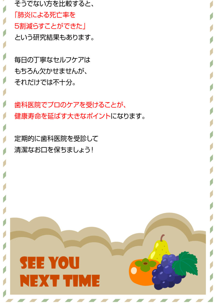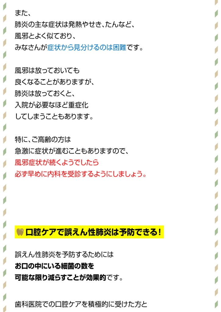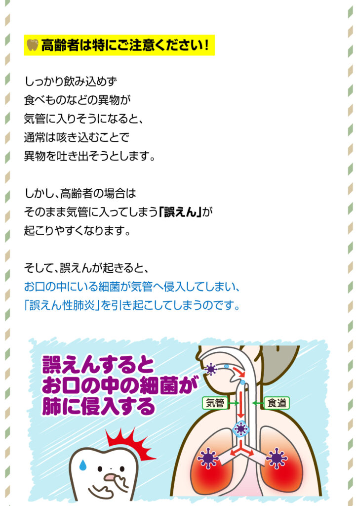 これには口腔内の衛生状態だけではなくオーラルフレイルも大きく影響しています。